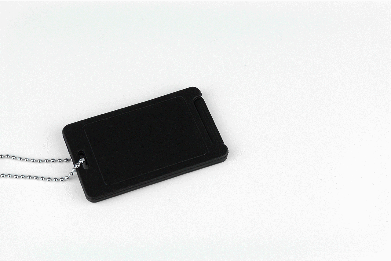 An elegant luggage tag made from plastic with solid gloss in black colour .