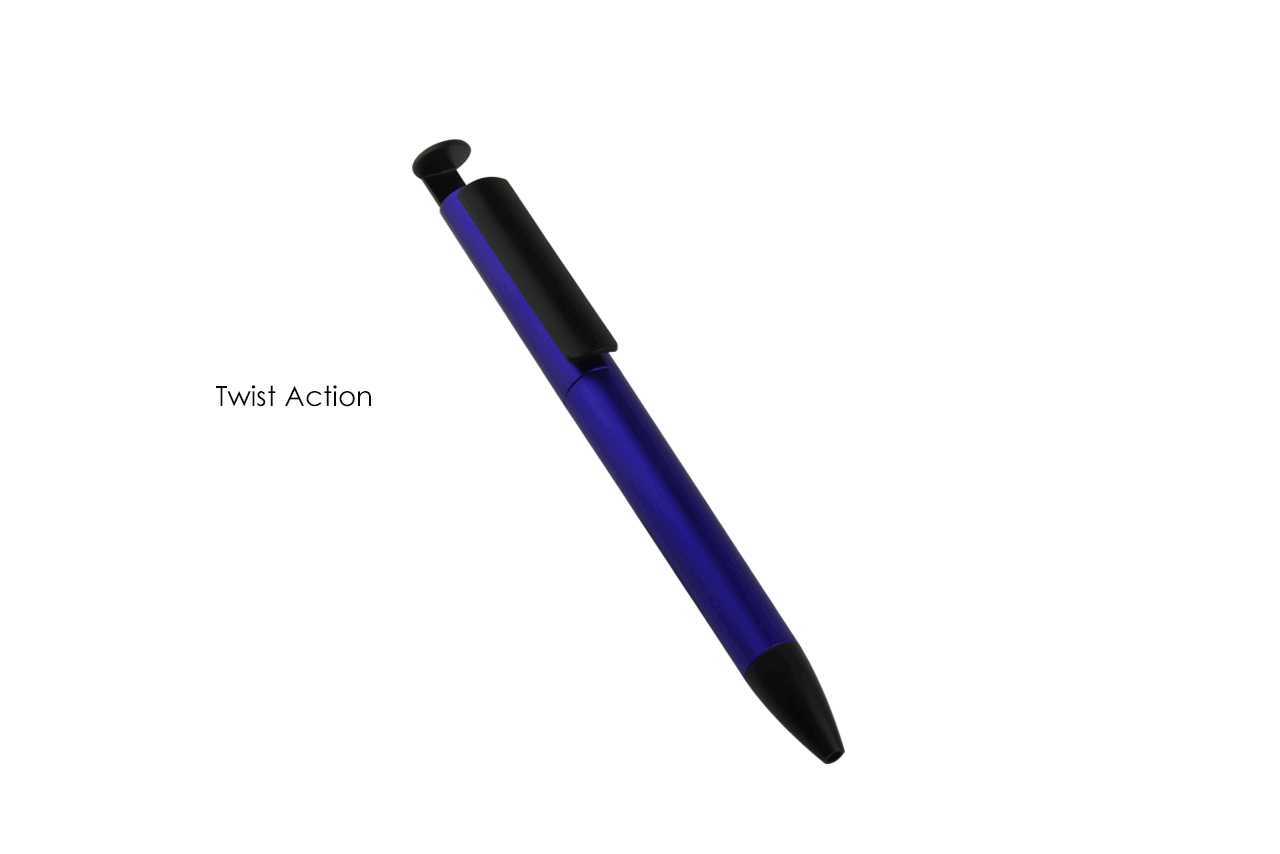 A multifunction plastic ball pen . A twist action pen . It also act as Smartphone stand . Each packed in an OPP bag.