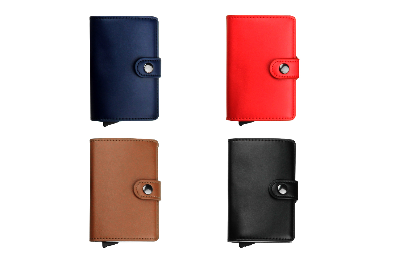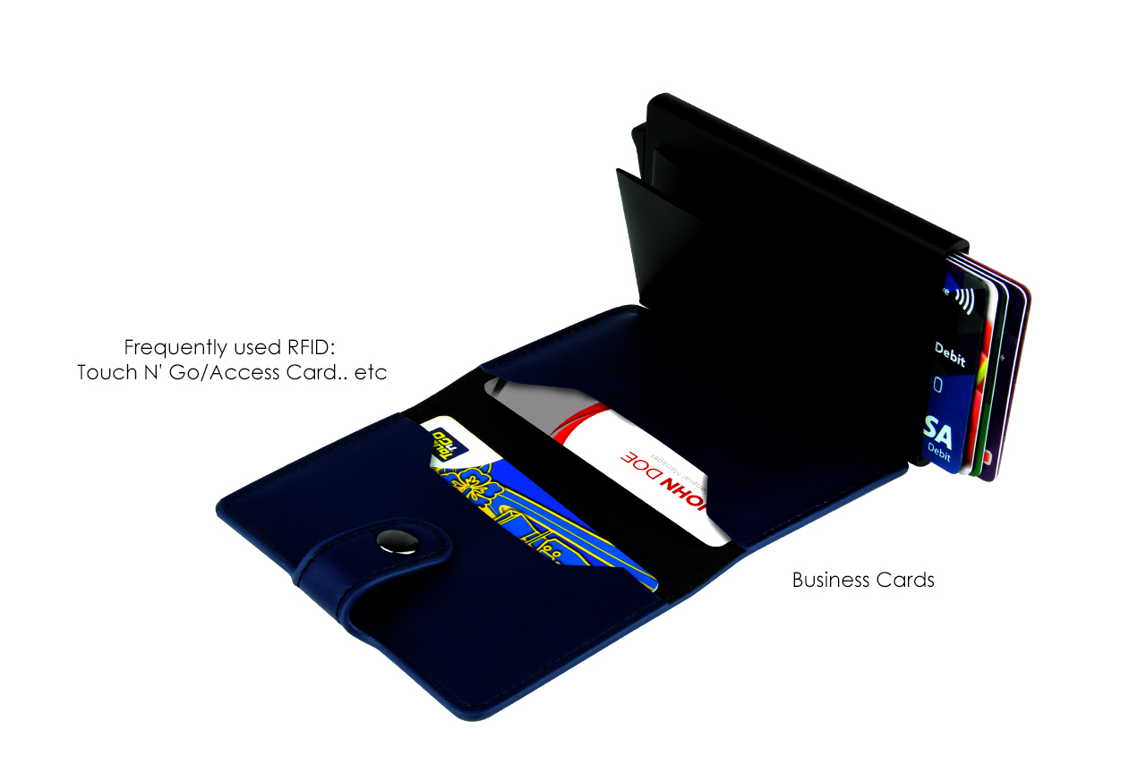 Multifunctional Credit card wallet Material: Aluminum & PU Aluminium case holds and dispenses 6 credit cards, RFID protected Inner slot for holding cash and receipts. Inner PU cover with two section for business card and frequently used RFID card such as Access Card or Touch 'N Go.
