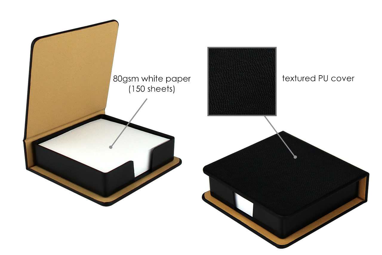 Memo pad . Paper : 80gsm white paper without printing/150 sheets . Box: PU cover with plastic box